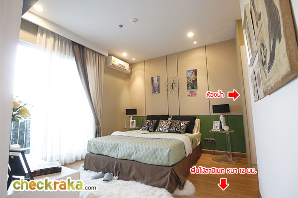 เข้ามาดูห้องนอนใหญ่ พื้นห้องปูด้วยลามิเนตเนื้อไม้ ความหนา 12 มม.