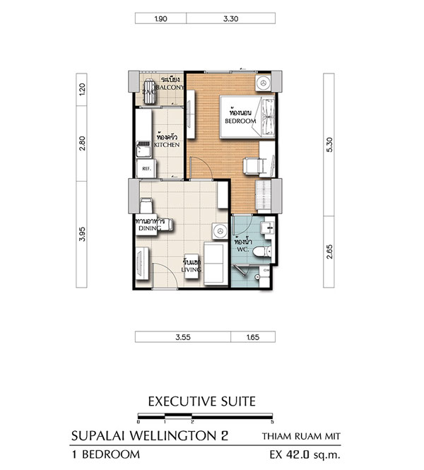 Layout ห้องแบบ 1 ห้องนอน EXECUTIVE SUITE ขนาด 42.0 ตร.ม.