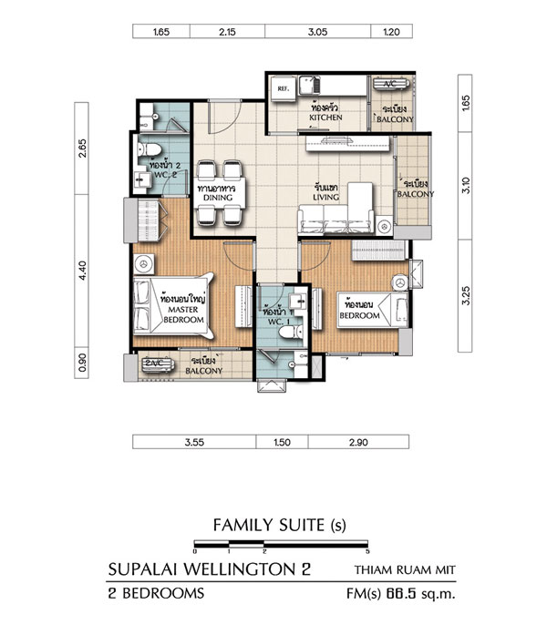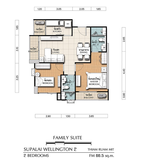 (คลิกเพื่อชมแปลนห้องขนาดใหญ่) - FAMILY SUITE ห้องแบบ 2 BEDROOM (2 ห้องนอน, 2 ห้องน้ำ, 1 ห้องครัว) - เนื้อที่ 66.50 ตร.ม.