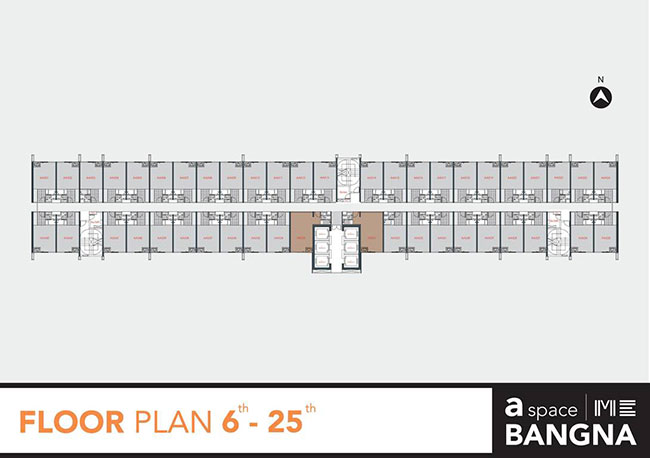 ส่วนตั้งแต่ชั้น 6-25 ก็จะมีการจัดวางผังและตำแหน่งของห้องแบบเดียวกันหมดค่ะ ห้องส่วนใหญ่ในโครงการเป็นห้องแบบ YOU SPACE ขนาดพื้นที่ใช้สอย 25 ตร.ม. (มี 43 ยูนิต/ชั้น) ส่วนห้องแบบ WE SPACE ที่มีขนาดพื้นที่ใช้สอย 32.10 ตร.ม. จะมีเพียง 2 ยูนิตต่อชั้น ตั้งอยู่ข้างโถงลิฟต์ซ้าย 1 ยูนิตและขวา 1 ยูนิต (ตำแหน่งห้องสีน้ำตาลใน Floor Plan ค่ะ)