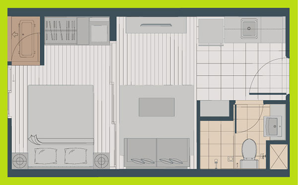 โดยส่วนแรกตรงประตูทางเข้าคือพื้นที่ส่วนห้องน้ำและครัว ส่วนที่สองเป็นพื้นที่รับแขก