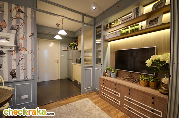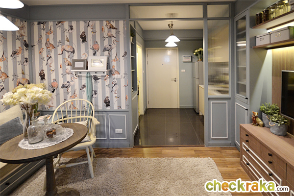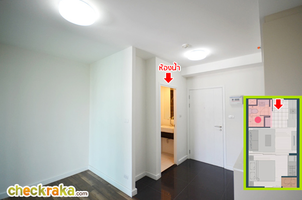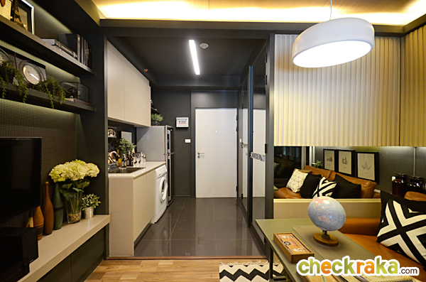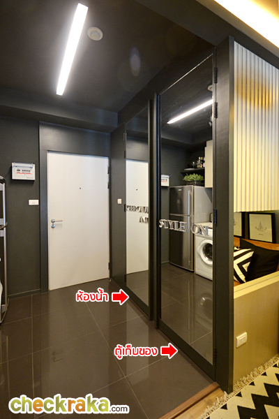 เปิดประตูห้องเข้ามาเจอกับพื้นที่ส่วนของห้องน้ำ (ทางซ้าย) และส่วนครัว (ทางขวา) ถัดไปเป็นห้องนั่งเล่น