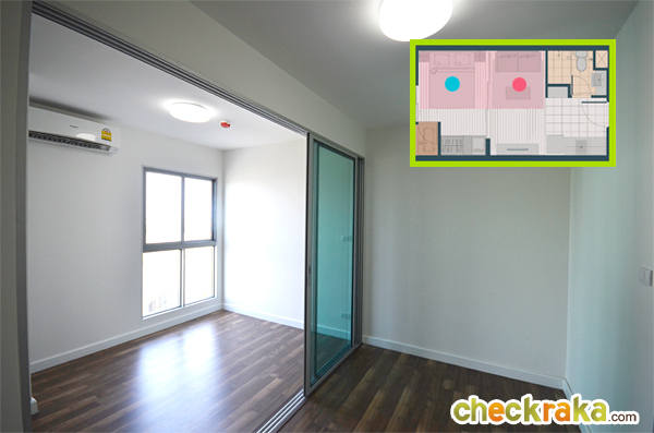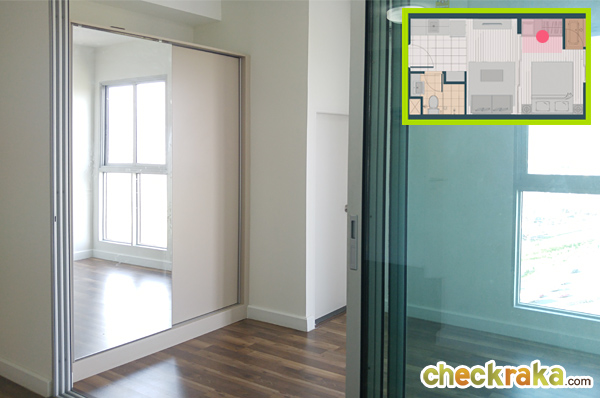 ถ่ายย้อนจากหัวนอนอีกด้านให้เห็นประตูระเบียง และจุดที่วางตู้เสื้อผ้าบิวท์อินค่ะ ตำแหน่งของตู้เสื้อผ้าตามนี้เลยนะคะ