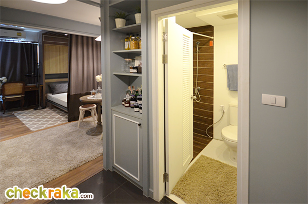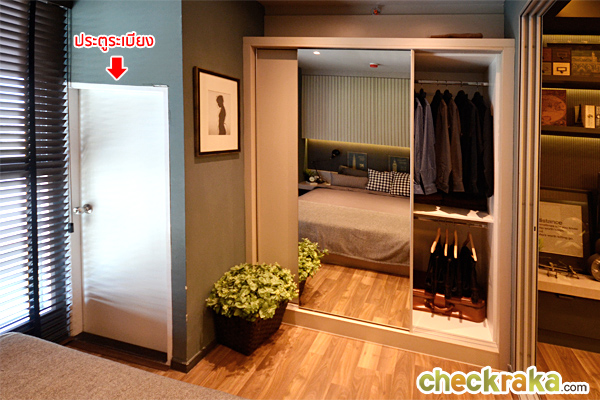 ฝั่งตรงข้ามกับครัว เป็นห้องน้ำ ซึ่งทางโครงการดีไซน์ประตูห้องน้ำมาเป็นกระจกเงา ทำให้ห้องดูกว้างขึ้น