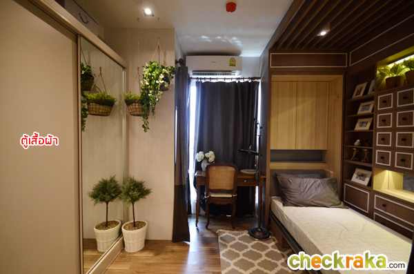 - แบบห้องและวัสดุ: โครงการออกแบบห้องแนวลึกเพื่อเน้นประโยชน์ในเรื่องของการใช้พื้นที่ใช้สอยให้คุ้มค่า โดยการลดขนาดพื้นที่ระเบียงซึ่งคนส่วนใหญ่มักไม่ค่อยใช้งาน แล้วนำมาเพิ่มพื้นที่ใช้สอยให้กับห้องนอน นอกจากนี้ตัวห้องแนวลึกยังทำให้แบ่งสัดส่วนพื้นที่ใช้งานได้อย่างชัดเจน ส่วนวัสดุที่ทางโครงการเลือกใช้ที่น่าชมเชยเห็นจะเป็นการเลือกติดตั้งประตูกระจกบานเลื่อนขนาดใหญ่สามบานที่ดูลงตัวทั้งในเวลาเลื่อนปิดกั้นห้องนอน และยามเลื่อนเปิดเมื่อต้องการรวมพื้นที่ห้องนอนกับห้องรับแขกเข้าไว้ด้วยกัน นอกนั้นวัสดุส่วนใหญ่ก็สอบผ่านเกณฑ์มาตรฐานทั้งหมด ตั้งแต่งานพื้นกระเบื้องในห้องอาบน้ำและครัว พื้นลามิเนตที่ส่วนพักผ่อน แบรนด์สุขภัณฑ์ American Standard มีแค่ขนาดของตู้เสื้อผ้า Built-in ที่ดูจะเล็กไปสักหน่อยถ้า Built-in ให้สูงเต็มผนังน่าจะได้พื้นที่จุของเพิ่มอีกเยอะค่ะ