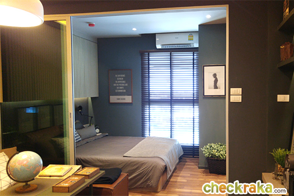ห้องนี้เอาประตูบานสไลด์ระหว่างห้องนั่งเล่นและห้องนอนออก และติดเป็นม่านบังสายตาแทน ซึ่งข้อดีคือเวลาที่รูดม่านพับเก็บชิดกับผนังจะช่วยทำให้พื้นที่โซนนี้เชื่อมต่อกันดูกว้างขวางมากยิ่งขึ้น