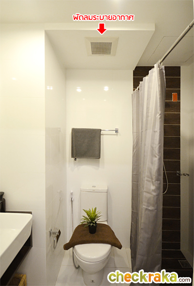 โซนอาบน้ำไม่มีฉากกั้นอาบน้ำให้นะคะ แนะนำให้ติดฉากกั้นอาบน้ำ หรือหาม่านมาบังเพื่อช่วยป้องกันน้ำกระเด็นออกมาโซนด้านนอก ส่วนพื้นและผนังปูกระเบื้องลายไม้สีเข้มตัดกับสีขาว