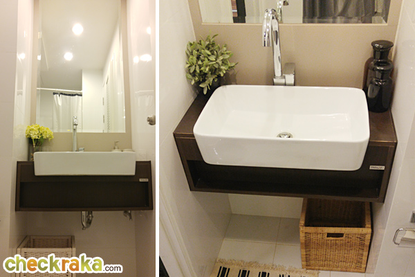 พื้นที่เว้าหน้าห้องน้ำ Built-in ทำเป็นชั้นวางของ และตู้เก็บของด้านล่าง