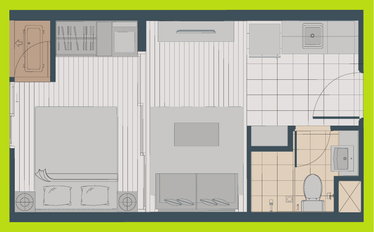 โดยส่วนแรกตรงประตูทางเข้าคือพื้นที่ส่วนห้องน้ำและครัว ส่วนที่สองเป็นพื้นที่รับแขก