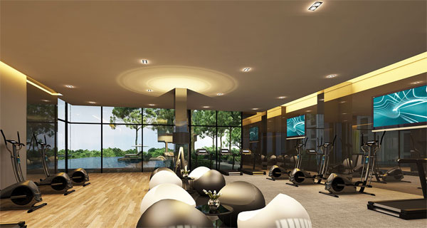 ภาพจำลองบรรยากาศภายในห้องฟิตเนส ที่เชื่อมต่อกับสระว่ายน้ำ