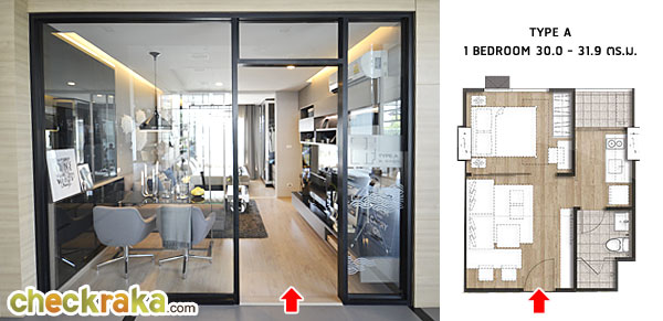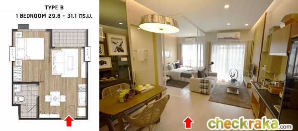 ขนาด 30.0 - 31.9 ตร.ม. ราคาเริ่มต้นประมาณ 2.19 ล้านบาท - ห้อง 1 ห้องนอน แบบ Type B