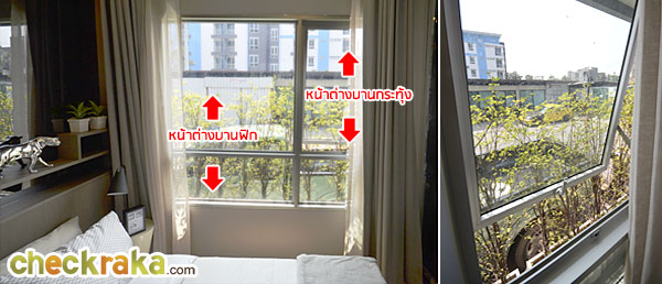 หน้าต่างกระจกในห้องนอนขนาด 1.9x1.6 ม. ด้านซ้ายเป็นแบบปิดตาย ส่วนด้านขวาเป็นแบบบานกระทุ้ง
