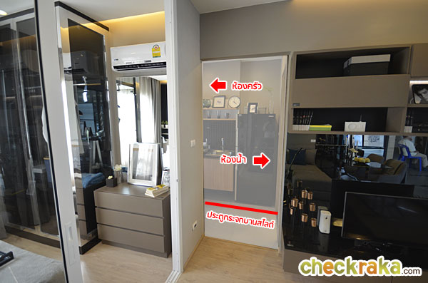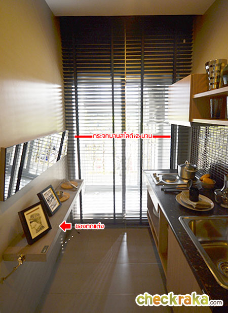 ทางเข้าห้องครัวจะเชื่อมต่อกับห้องนอน โดยประตูทางเข้าห้องครัวที่โครงการให้มาจะเป็นประตูกระจกบานสไลด์