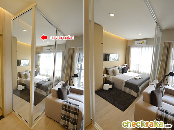 ถัดมาอีกจะเป็นส่วนของห้องนอน ซึ่งกั้นห้องเพิ่มความเป็นสัดส่วนด้วยกระจกบานสไลด์แบบ 3 ตอน