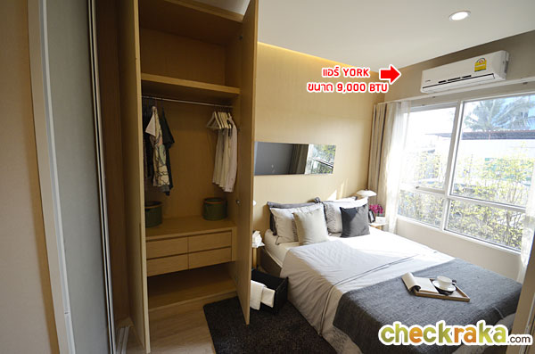 ปลายเตียงเป็นตำแหน่งของตู้เสื้อผ้า โต๊ะเครื่องแป้ง และแอร์ขนาด 9,000 BTU