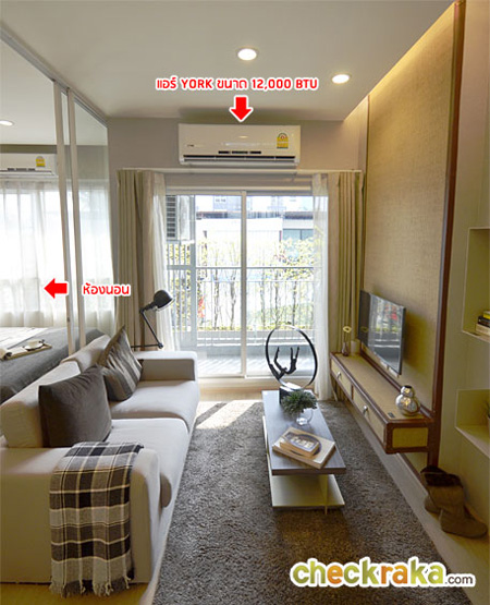 ในห้องนี้มีแอร์ ขนาด 12,000 BTU ให้ด้วย 1 ตัวนะคะ จะติดไว้บริเวณเหนือประตูระเบียง