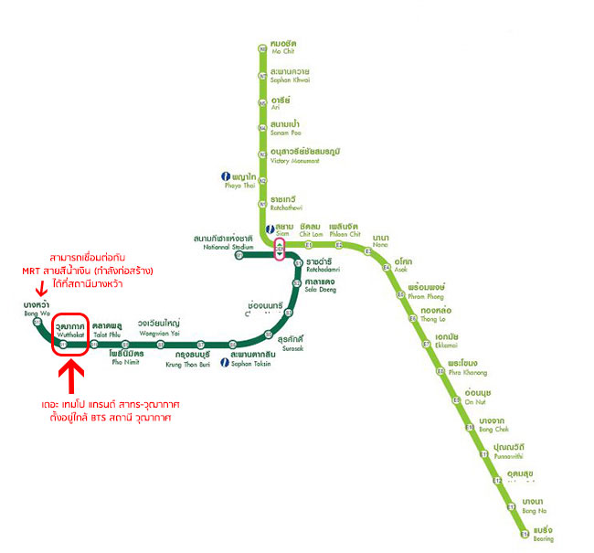 - รถไฟฟ้า MRT สายสีน้ำเงิน จากวุฒากาศ เพียง 1 สถานี ก็จะถึงสถานีบางหว้า ซึ่งเป็นสถานีที่เชื่อมต่อกันระหว่างรถไฟฟ้าสายสีน้ำเงิน และรถไฟฟ้าสายสีเขียว