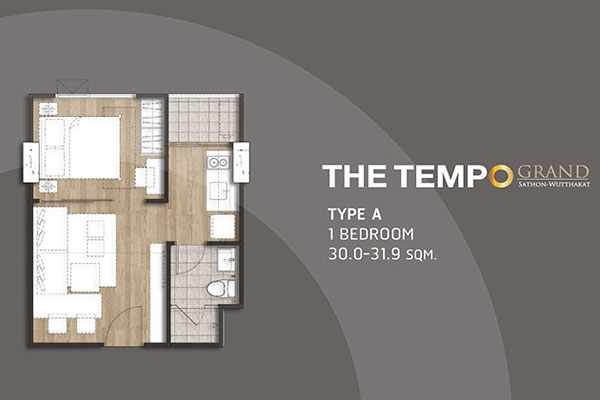 - TYPE A ห้องแบบ 1 BEDROOM (1 ห้องนอน, 1 ห้องน้ำ, 1 ห้องครัว) - เนื้อที่ 30.00 - 31.09 ตร.ม.