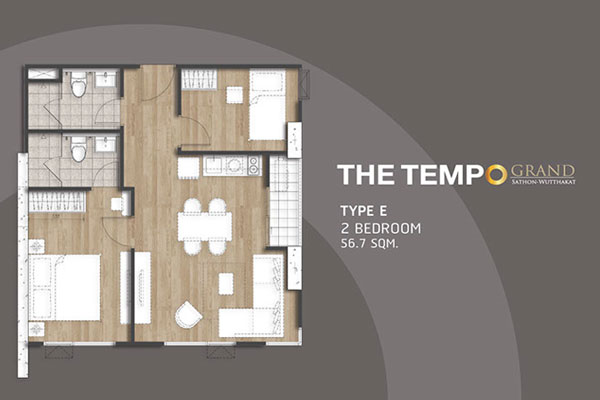 (คลิกเพื่อชมแปลนห้องขนาดใหญ่) - TYPE E ห้องแบบ 2 BEDROOM (2 ห้องนอน, 2 ห้องน้ำ, 1 ห้องครัว) - เนื้อที่56.70 ตร.ม.