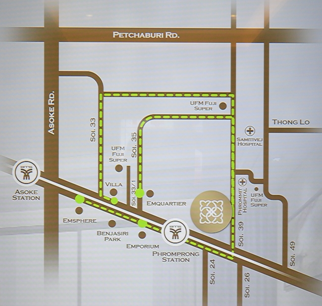 - Travelling-in-and-out of Project: Using a private car is quite convenient because the street of Sukhumvit 39 is well connected and accessible to, and from, all surrounding streets such as Sukhumvit 33, Sukhumvit 35, Sukhumvit 49/4 and Petchburi 38/1. In effect, this Sukhumvit 39 can lead us to all such main roads as Asoke, Petchburi, Thonglor and Nana. This is a plus of this project because the residents can have a number of choices in terms of commuting. In addition, the proximity to Phrom Phong BTS Station offers the residents with broader choices of travelling as it takes just a two-minute walk to and from this BTS station. This BTS station is just one stop away from Asoke BTS Station which is the interchange station linking BTS and MRT. All in all, traveling in and out of the project is convenient and the transportation around the project is relatively good.