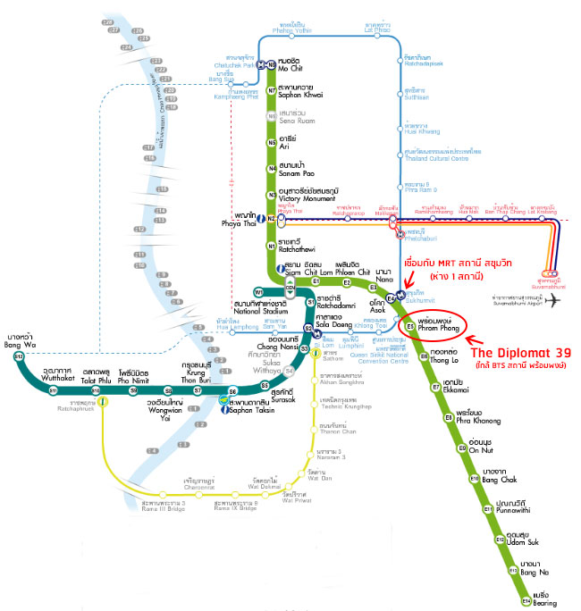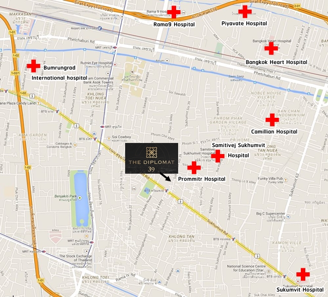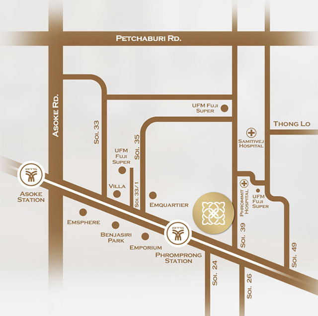 The Diplomat 39 is located in Sukhumvit 39, Sukhumvit Road, Bangkok. It is close to Phrom Phong BTS Station, Sukhumvit MRT Station, Thonglor, Asoke, Ekkamai, Nana and Petchaburi and surrounded by luxury shopping centers like The Emporium, The EmQuatier, The Emsphere and a few walks to several Thai, Japanese and International hospitals, supermarkets and restaurants.