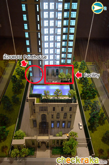 - Common Area Facilities and Project Building: Apart from the location which is convenient for travelling, close to shopping centers and in the middle of central business district, The Diplomat 39 is uniquely outstanding in the sense that its building design is a perfect combination between the Old World era and the New World era. It places emphasis on outer appearance and internal luxury by combining "Palladian Architecture" style (which is an architectural style deriving from, and inspired by, Italian designs) and modern conveniences in the current world. The project is situated on a plot of land having the size of 1-3-37 Rais (equal approximately to 2,948 square meters) and stands at the height of 31 floors. Each floor comprises only a few units and this low number of units could make residents feel private and exclusive. There are 4 passenger elevators and 1 freight elevator on each floor and this represents a proportion of 1 passenger elevator for 39 units which is an excellent proportion and not at all crowded. The common area is full of convenient facilities ranging from an octagon-shaped grand lobby, waiting lounge and business center. In addition, there is a grand room called "The Salon" which can be used to welcome visitors or be converted into a ballroom with separate entrance and exit for caterers in a manner which does not bother the residents and another grand room called "The Club" which is a common room for those who want to read or study privately and stands at the height of 5 meters. One swimming pool is also available as well as green area and fully-equipped gym. The parking space occupies the 1st - 6th floors of the building and can accommodate 160 cars (not including double-parking).