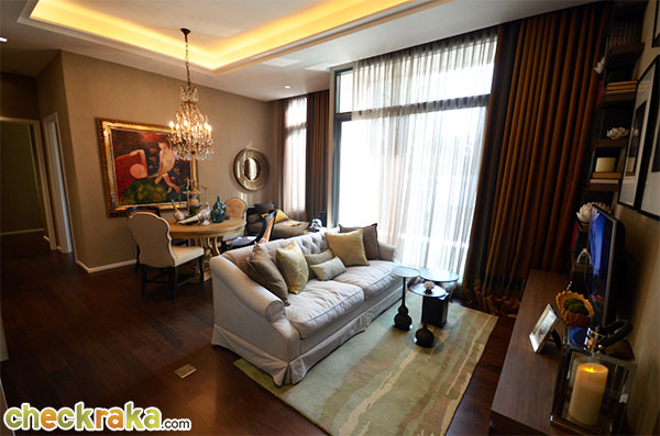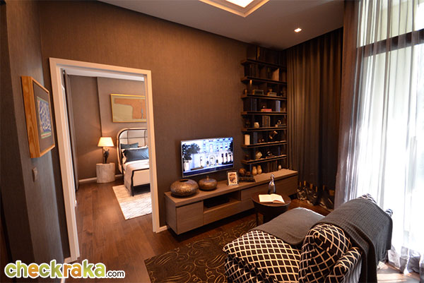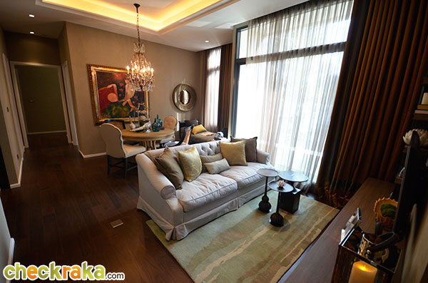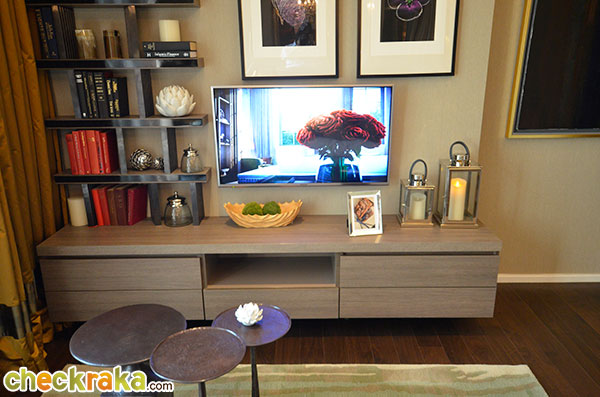 ภายในห้องนั่งเล่น แบ่งออกเป็น 2 ส่วน โดยทางห้องตัวอย่างตกแต่งให้ส่วนแรกเป็นโซฟาเอาไว้นั่งดูทีวีสบายๆ