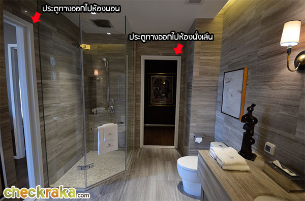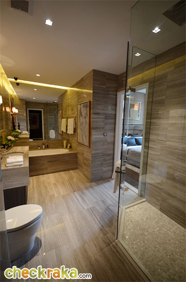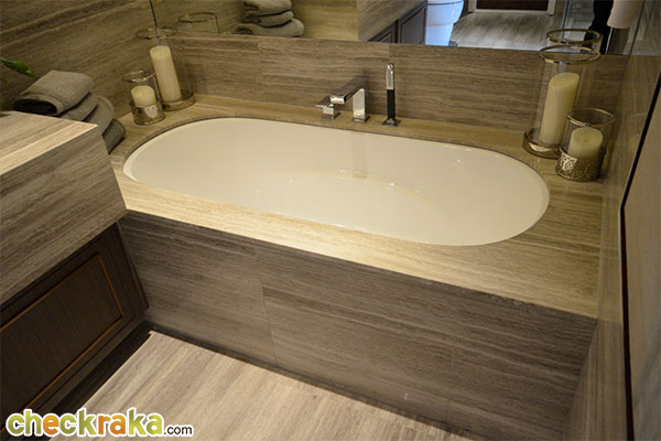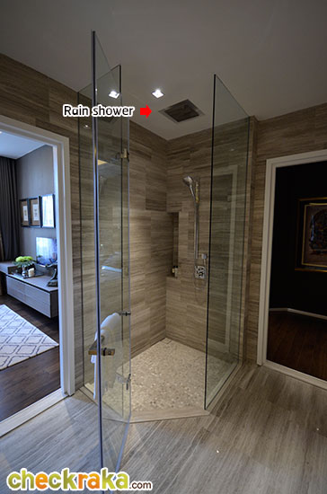 ภายในห้องน้ำปูด้วยหินอ่อนทั้งพื้นและผนังเหมือนกันกับห้องตัวอย่างแบบ 1 ห้องนอน