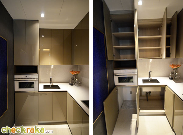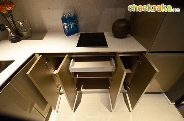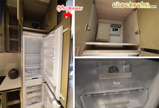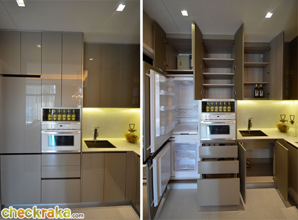 และในส่วนของ Pantry ทำอาหารก็มีทั้งตู้เย็นยี่ห้อ Teka และเตาอบไมโครเวฟ ยี่ห้อ Kuppersbusch แบบบิ้วท์อินให้