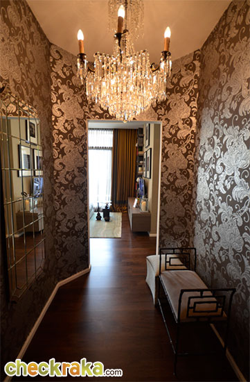 (Walking into the unit, there will be a large foyer. The sample unit is wall-papered with slightly darker color and tone. However, for the actual unit to be delivered to customers, the unit will instead be wall-papered with much lighter color such as a mixture of while and cream colors)