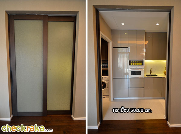 ห้องครัวแบ่งพื้นที่ด้วยพื้นกระเบื้องขนาด 60x60 ซม. มีบานเลื่อนเปิด-ปิด เพิ่มความสวยงาม