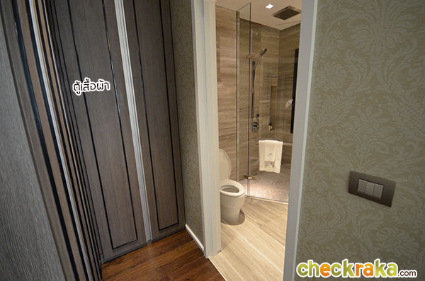 ตอนกลางคืน ก็แค่เดินข้ามไปไม่กี่ก้าว สะดวกสบายทีเดียวค่ะ และจะมีตู้เสื้อผ้าบิวท์อินให้แบบนี้ในทุกห้อง