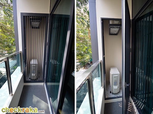 ตำแหน่งที่วางคอยล์ร้อนของแอร์ตรงระเบียงห้องนั่งเล่น ทางโครงการคิดไว้ให้มีการจัดวางในลักษณะนี้