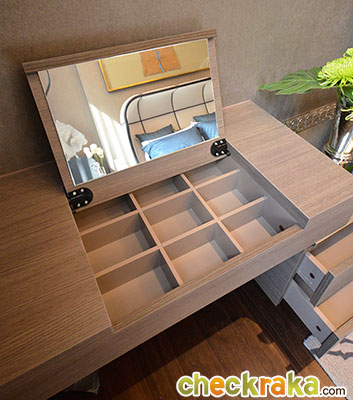 ซูมใกล้ๆ กับโต๊ะเครื่องแป้ง 2 in 1 ที่มีทั้งกระจก และช่องให้ใส่เครื่องประดับ