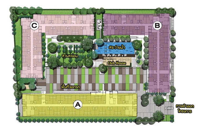 Master Plan ของชั้น G ซึ่งชั้นนี้จะมีในส่วนของ Facility กลางแจ้งอย่างลานจอดรถ, Club House, สระว่ายน้ำ, สวนสีเขียว, สวนในอาคารก็จะมีในส่วนของห้องจดหมาย ลิฟต์โดยสารอาคารละ 2 ตัว และห้องพักอาศัย สำหรับอาคาร B และอาคาร C ห้องพักอาศัยจะเริ่มตั้งแต่ชั้น G เลย ส่วนอาคาร A ที่ชั้น G จะเป็นส่วนของพื้นที่จอดรถ ส่วนห้องพักอาศัยจะเริ่มตั้งแต่ชั้น 2 เป็นต้นไปค่ะ โดยจำนวนยูนิตเฉลี่ยของแต่ละอาคารก็จะแตกต่างกันเล็กน้อย