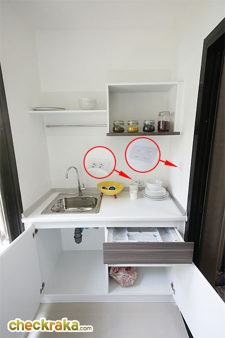 ตรงจุดทานข้าวนี้ทางโครงการติดตั้งปลั๊กไฟมาให้ด้วยค่ะ เผื่อใครจะใช้จุดนี้เป็นพื้นที่วางตู้เย็นขนาดไม่ใหญ่มาก และอาจย้ายโต๊ะทานข้าวมาไว้อีกฝั่ง แต่ก็จะทำให้เสียพื้นที่ในการเดินเข้า-ออกครัวไปอีกหน่อยนึง