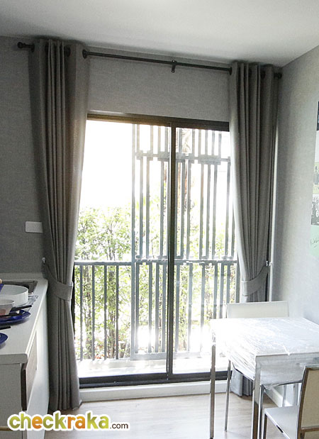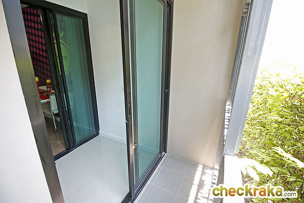 และถัดจากห้องครัวออกไปจะเป็นส่วนของระเบียงที่กั้นด้วยกระจกใสแบบบานเลื่อน 2 ตอน พร้อมมีราวกันตก