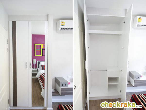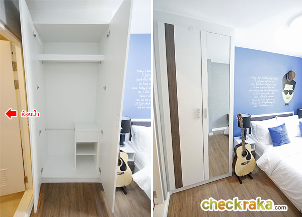 ด้านข้างประตูจะเป็นที่ตั้งของตู้เสื้อผ้า ซึ่งติดกับหน้าต่าง