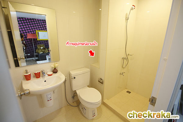 พร้อมพื้นที่เล็กๆ สำหรับวางอุปกรณ์ในการอาบน้ำซึ่งจะอยู่ข้างโถสุขภัณฑ์ ส่วน Shower box เป็นแบบอาบได้ 1 คน