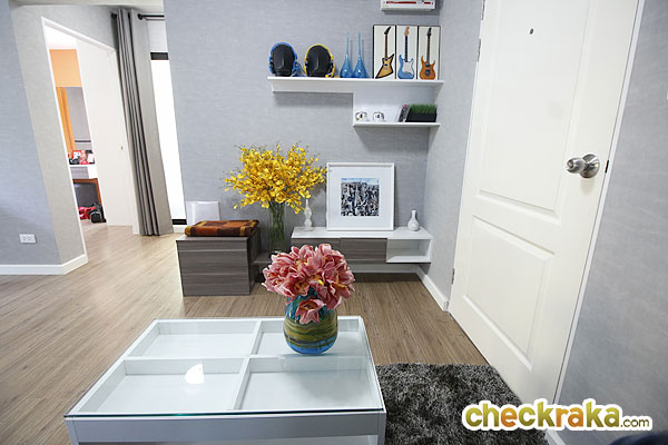 เข้ามาด้านในพื้นห้องเป็นลามิเนตหนา 8 มม. ความสูงจากพื้นถึงฝ้าอยู่ที่ 2.5 เมตร มุมขวาจะเป็นชั้นวางทีวีแบบ Built-in เชื่อมต่อกับห้องน้ำ และห้องนอน หน้าชั้นวางทีวีมี Door Stopper ป้องกันประตูกระแทกมาให้ด้วย
