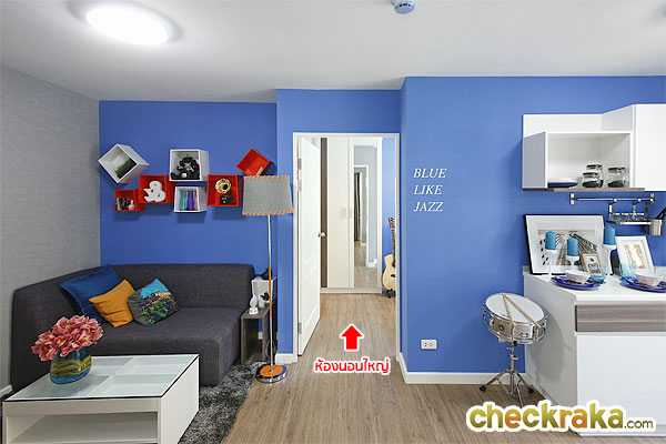 ด้านซ้ายเป็นส่วนของ Living Area พร้อมโซฟาแบบ 2 ที่นั่ง และโต๊ะกลาง ระยะดูทีวีประมาณ 3 เมตร