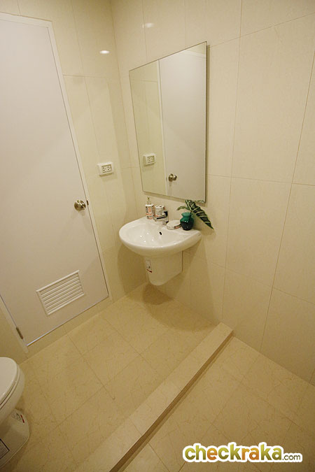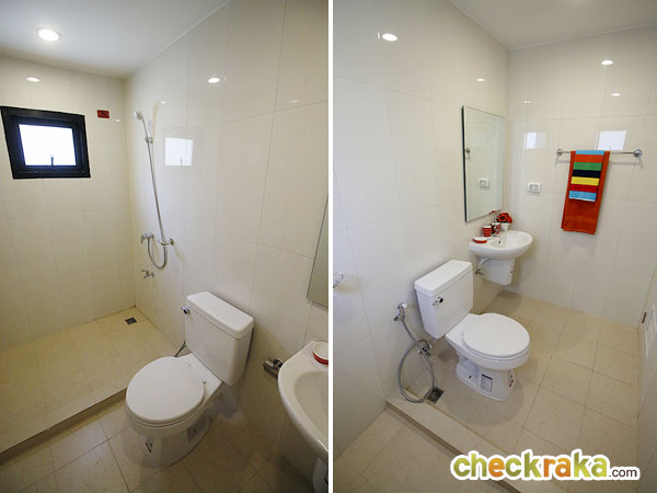 ภายในห้องน้ำ เปิดเข้ามาจะเจอกับ อ่างล้างหน้า และโถสุขภัณฑ์ ส่วนด้านซ้ายจะเป็น Shower Box มีมีขนาดกว้าง อาบได้สบายๆ นอกจากนี้ยังมีหน้าต่างบานกระทุ้งช่วยระบายอากาศมาให้ด้วย (สำหรับห้องที่เป็นห้องมุม)