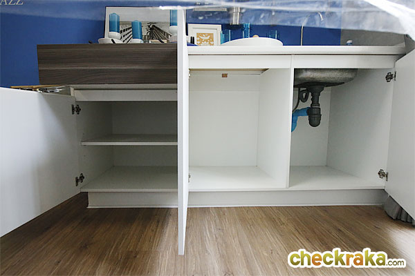 เคาน์เตอร์ครัวมีพื้นที่เก็บของมาให้เยอะเลยทีเดียวทั้งข้างบนและข้างล่าง ด้านซ้ายเป็นอ่างล้างจานสแตนเลสแบบ 1 หลุม