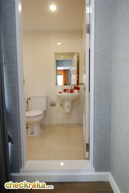 ธรณีประตูห้องน้ำเป็นแบบยกสูงช่วยป้องกันน้ำไหลมาด้านนอก แต่เวลาเดินก็ระวังสะดุดด้วยนะคะ