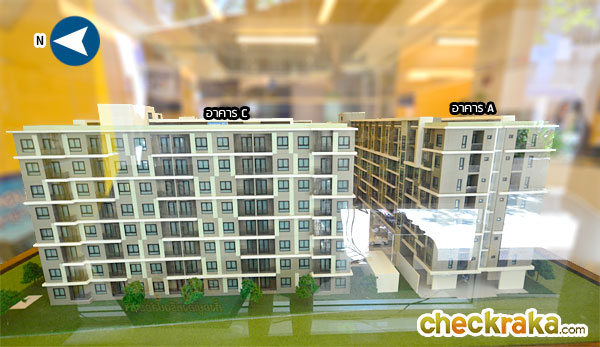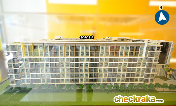 โมเดลโครงการมุมมองจากทิศเหนือ ติดอาคารสูง 8 ชั้น ซึ่งกำลังปลูกสร้างอยู่