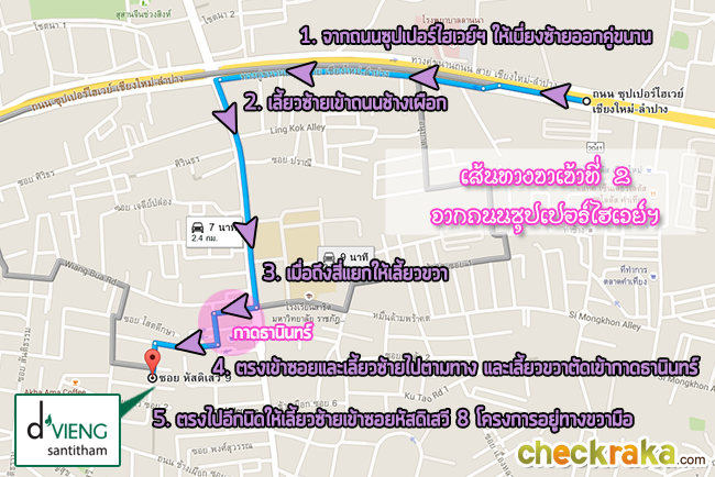 เดินออกมานิดหน่อยและเลี้ยวซ้ายจะเป็นหัสดิเสวี ซอย 8 เป็นซอยที่ติดกับอาคารบี โครงการดีเวียง สันติธรรม