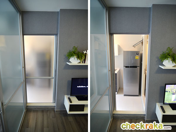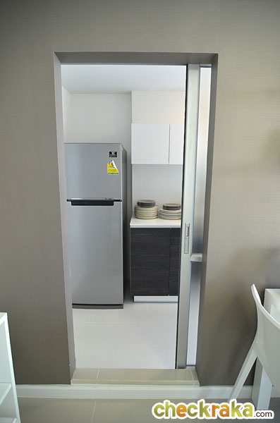 เดี๋ยวเข้าไปดูห้องครัวกันค่ะ ห้องครัวเป็นแบบครัวปิด กั้นด้วยประตูกระจกฝ้าสีขุ่นแบบบานสไลด์