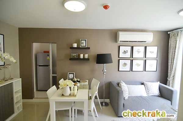 ห้องนี้ตกแต่งด้วยสีเบจโทนครีม-น้ำตาล ทำให้ห้องสว่างและดูกว้างขึ้น ทางซ้ายสุดของห้องที่เห็นเป็นประตูตรงนั้นเป็นห้องครัวค่ะ บริเวณกลางห้องจะเป็นโต๊ะทานข้าวขนาด 4 ที่นั่ง เชื่อมต่อกับส่วน Living Area ได้ไฟติดเพดานแบบโคมซาลาเปา