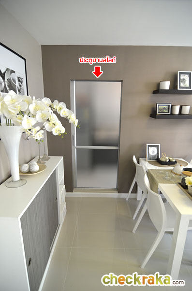 ประตูเข้าครัวเป็นประตูกระจกฝ้าบานสไลด์ เปิด-ปิดออกมาหน้าตาแบบนี้ค่ะ