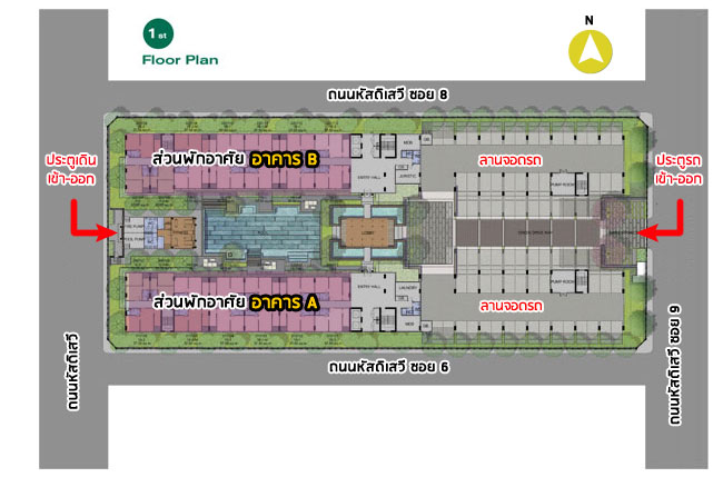 จากรูป Master Plan พื้นที่ชั้น 1 ของทั้ง 2 อาคารจะประกอบด้วยส่วนของห้องพักอาศัยอาคารละ 13 ยูนิต/ชั้น มีลิฟต์โดยสาร 2 ตัว/อาคาร อัตราส่วนลิฟต์เฉลี่ยอยู่ที่ 66:1 ส่วนของพื้นที่จอดรถอยู่ฝั่งทิศตะวันออก และสิ่งอำนวยความสะดวกที่ตั้งอยู่ระหว่าง 2 อาคาร